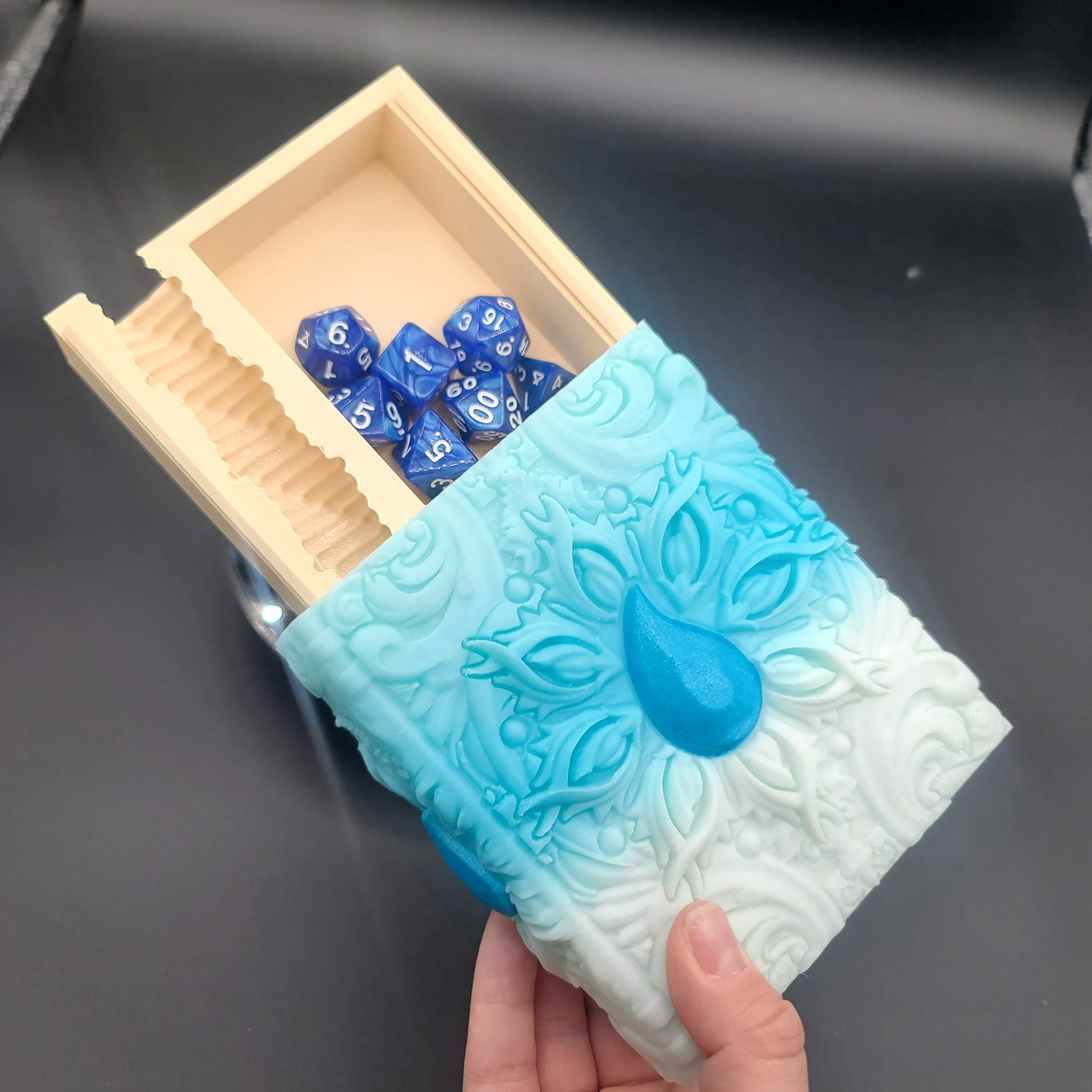 Expertly 3D printed for strength and detail, this dice tower is as reliable as it is beautiful. Lightweight enough for travel yet striking enough to display on any shelf, it’s a must-have centerpiece for game night.